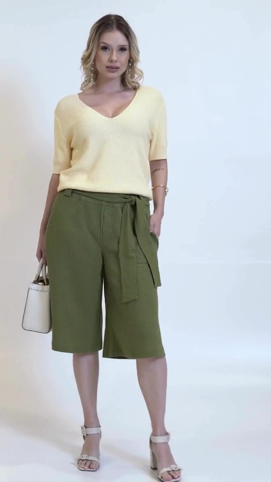 Cós: Alto com elástico na cintural, faixa e passadores.