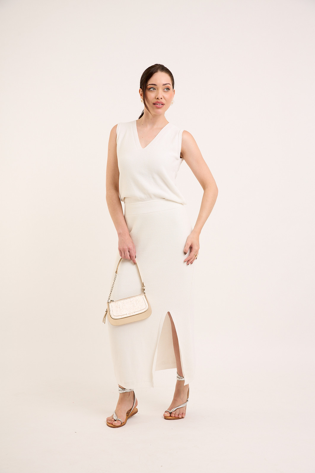 Detalhes da Peça Material: Tricot. Composição: 70% viscose, 30% poliamida Modelagem: Regata clássica, com corte que se ajusta de forma sutil ao corpo. Gola: Decote V Clássico Acabamento: Bainha e cavas com acabamento limpo e discreto em tricot