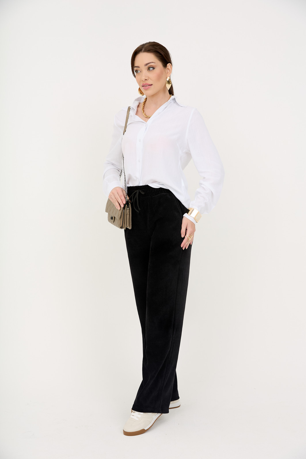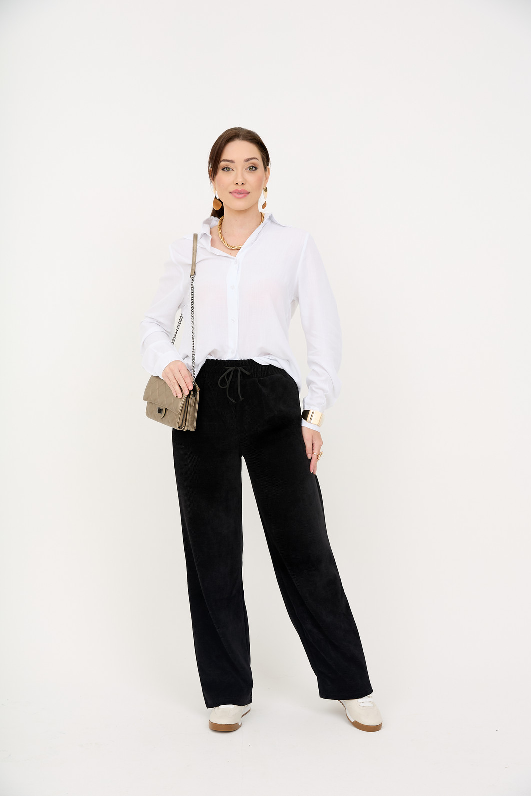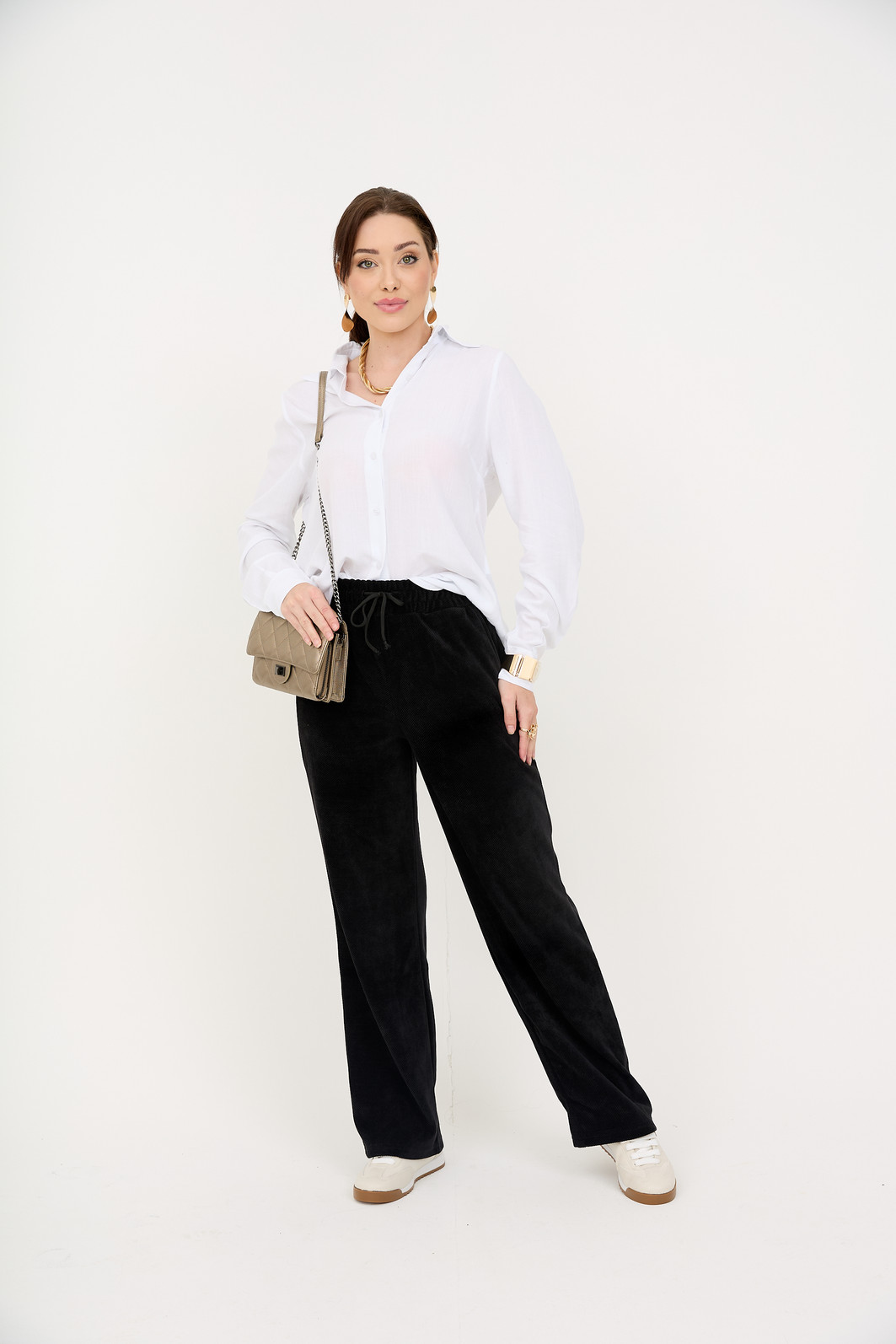 A modelagem reta traz equilíbrio entre conforto e elegância, sem marcar o corpo. A elasticidade garante liberdade de movimento, enquanto a estrutura do tecido mantém o visual alinhado.