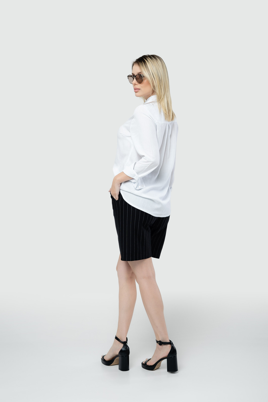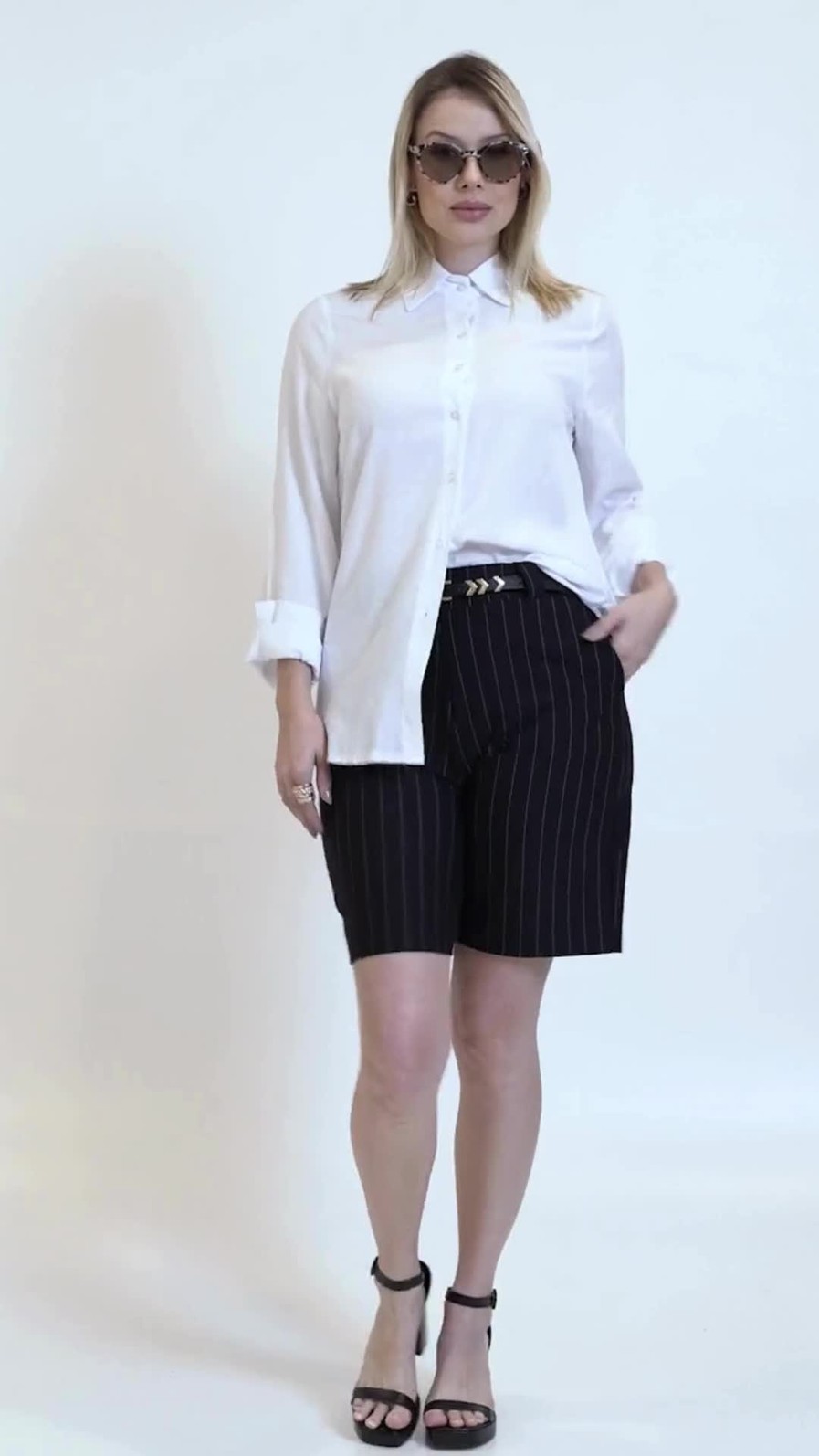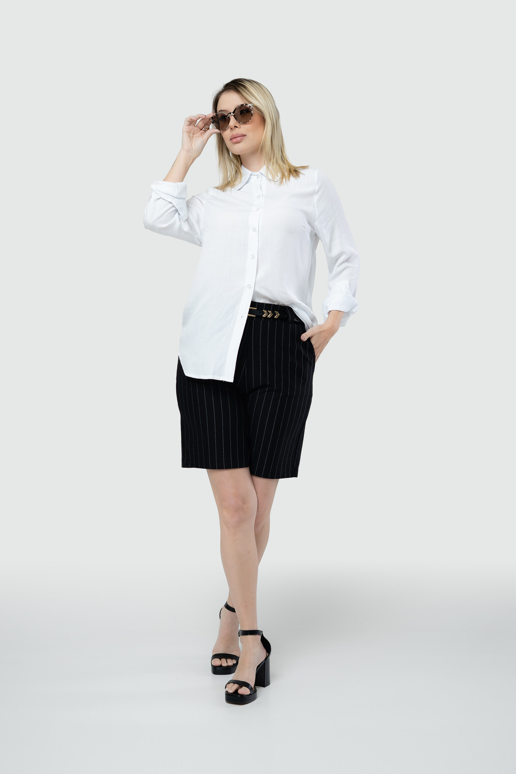 Modelagem: Clássica e versátil, com corte reto e caimento fluido que se adapta a diferentes biotipos. Gola: Gola clássica de camisa, estruturada na medida certa para um visual polido. Fechamento: Abotoamento frontal com botões discretos e de qualidade. Mangas: Longas, com punho e abotoamento. Podem ser facilmente dobradas, transformando o visual para um toque mais casual ou para os dias de temperatura mais elevada.
