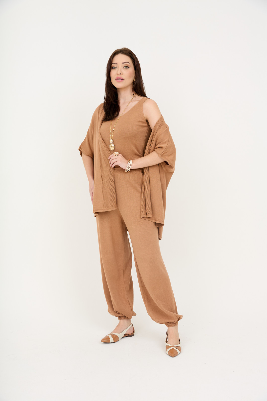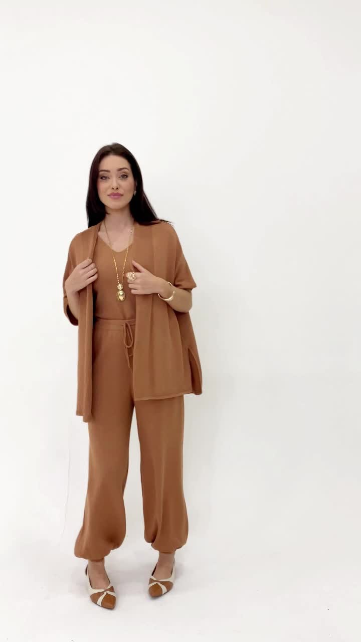 A proposta do trijunto oferece liberdade e praticidade, com peças que podem ser usadas juntas ou separadamente. O caimento solto não marca o corpo e garante conforto ao longo do dia, enquanto o tricot traz um visual sofisticado e atual.